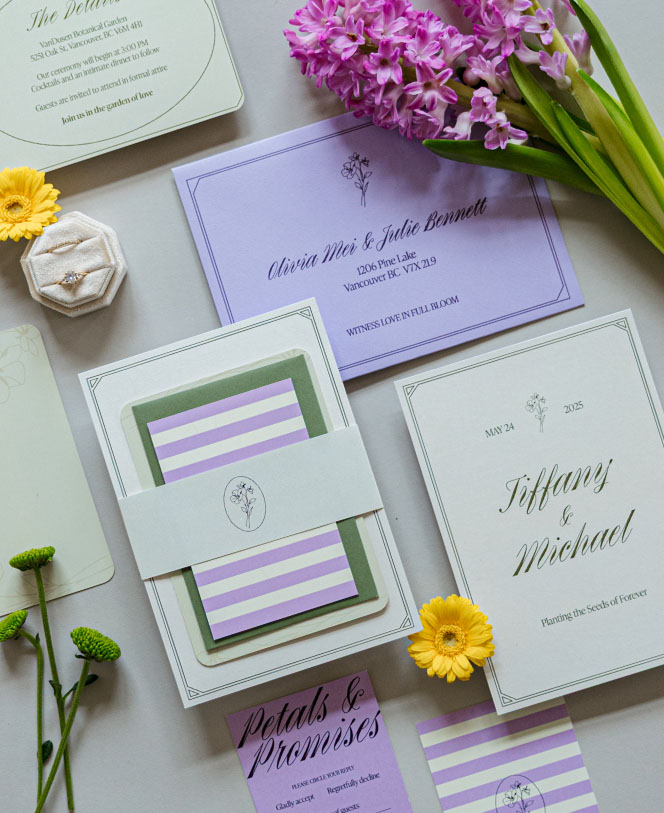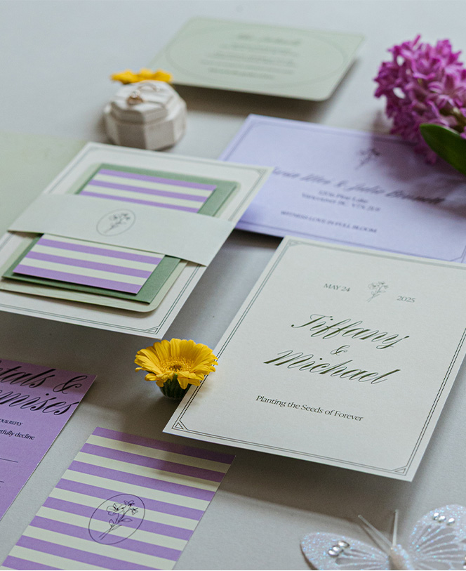 Soft lilac and sage tones come together for a fresh, botanical feel. This suite captures the charm of spring; delicate, refined, and endlessly romantic. Paired with subtle floral line art and elegant typography, it’s a timeless take on wedding invite examples that blend nature-inspired details with classic design.