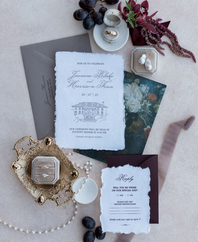 Or, if you want something truly original, let’s collaborate on a fully custom design that captures your exact vision. From concept to assembly and mailing, I’ll help bring your vision to life with my design and stationery expertise. Click here to discover my custom wedding invite packages.