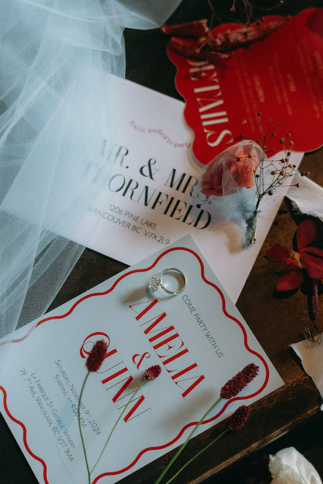 In this post, I’m sharing six different invitation styles I’ve designed, each showcasing a distinct look and feel. You’ll find everything from refined and timeless to playful and bold. These real wedding invite examples highlight how color, typography, and paper textures work together to create a cohesive story that reflects each couple’s day.