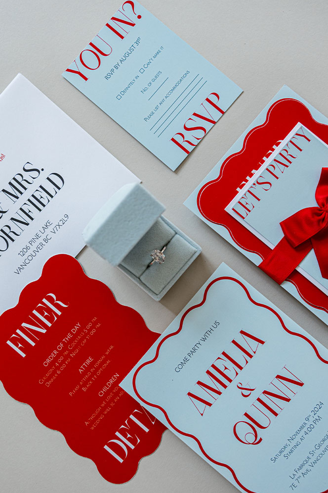 Bold, structured, and full of personality, this modern and editorial invitation suite redefines what a wedding invitation can be. Designed with wavy lines, confident typography, and unexpected color contrasts, it’s made for couples who want to make a statement.