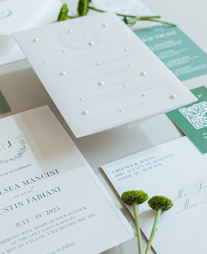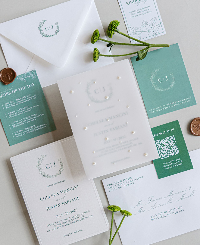 Subtle details, like the vellum overlay with pearl embellishments and custom wax seal, elevate the presentation without feeling overly ornate. The typography remains clean and structured, ensuring the design feels balanced and cohesive from start to finish. This invitation suite is printed on a linen paper for an added touch of luxury, especially with a handmade embossed border.