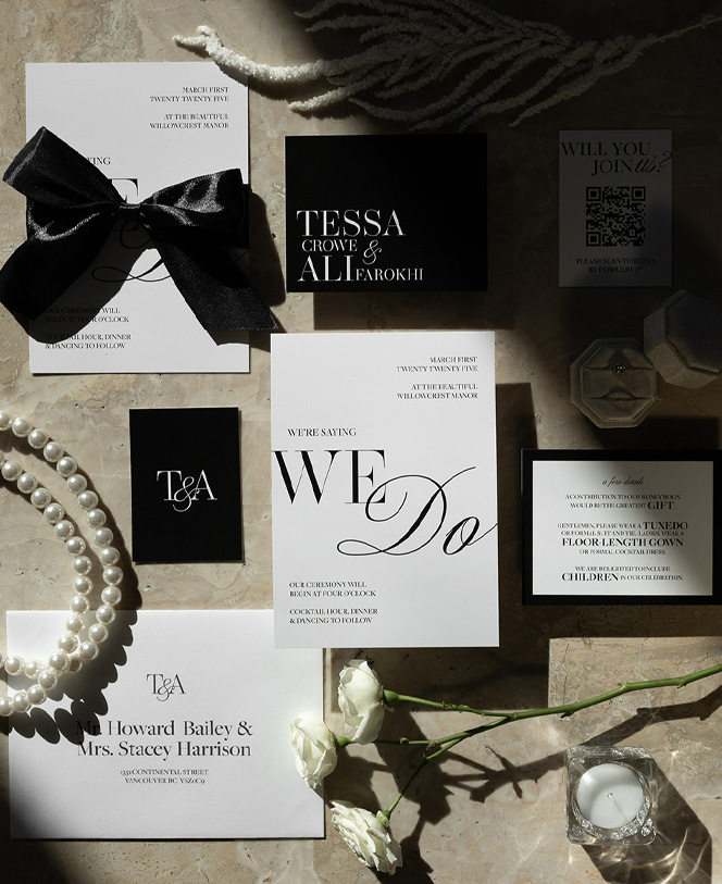 For couples drawn to sophistication and clean design, this modern and refined invitation suite captures the essence of timeless style. The black and white palette feels crisp and elevated, creating a statement that’s both minimal and impactful.