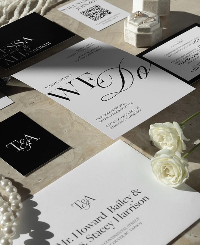 Typography takes the spotlight here. The mix of bold serif typefaces with delicate script details adds balance and depth, giving the design an editorial edge. Each element feels considered, from the “We Do” statement card to the custom monogram woven throughout the suite.