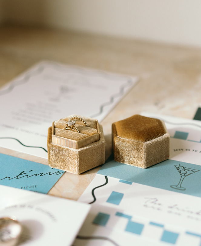 The mix of turquoise and emerald feels lively without being overwhelming, giving just the right amount of contrast. A checkered pattern and QR code RSVP add a modern, interactive twist that reflects today’s approach to weddings; less stiff, more “let’s party.”