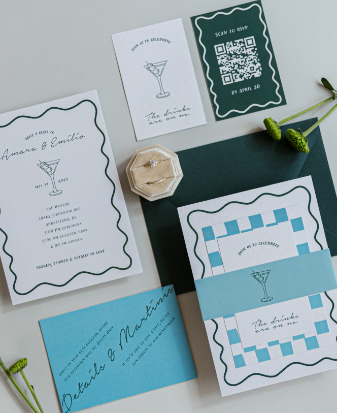 This suite is all about personality; fun, fresh, and made to make guests smile. From the martini illustration, to the drinking-related wording, to the wavy border details, every element brings a sense of celebration. It’s a perfect example of how wedding invites can be creative and personal.
