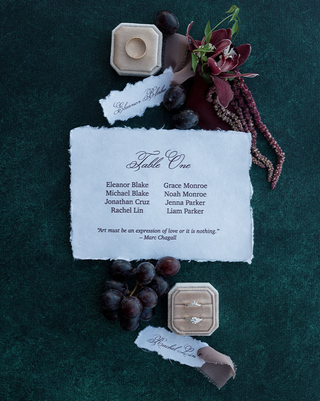 When you work with me, I design each element with intention. Placement cards integrate seamlessly with all your stationery pieces, your wedding aesthetic, and your tablescape decor to create a unified design story.