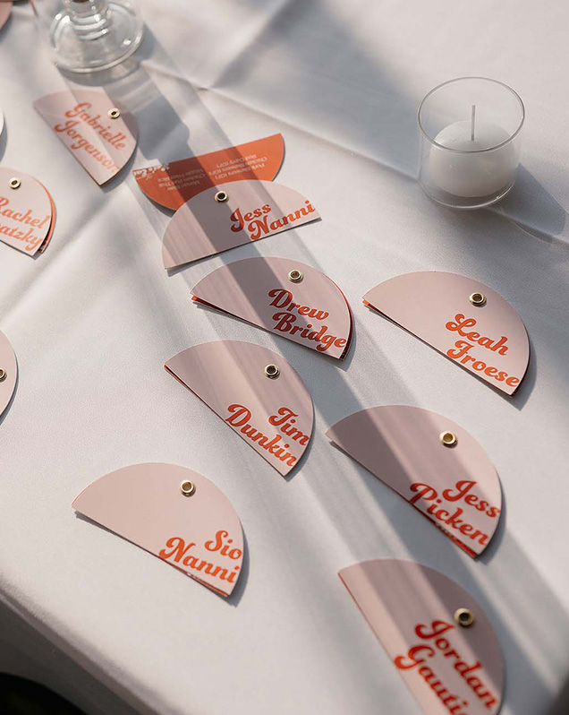 Acrylic placement cards create a sleek and modern presence. Names can be printed directly with UV printing or applied with vinyl lettering. This material works beautifully with contemporary or minimalist designs.